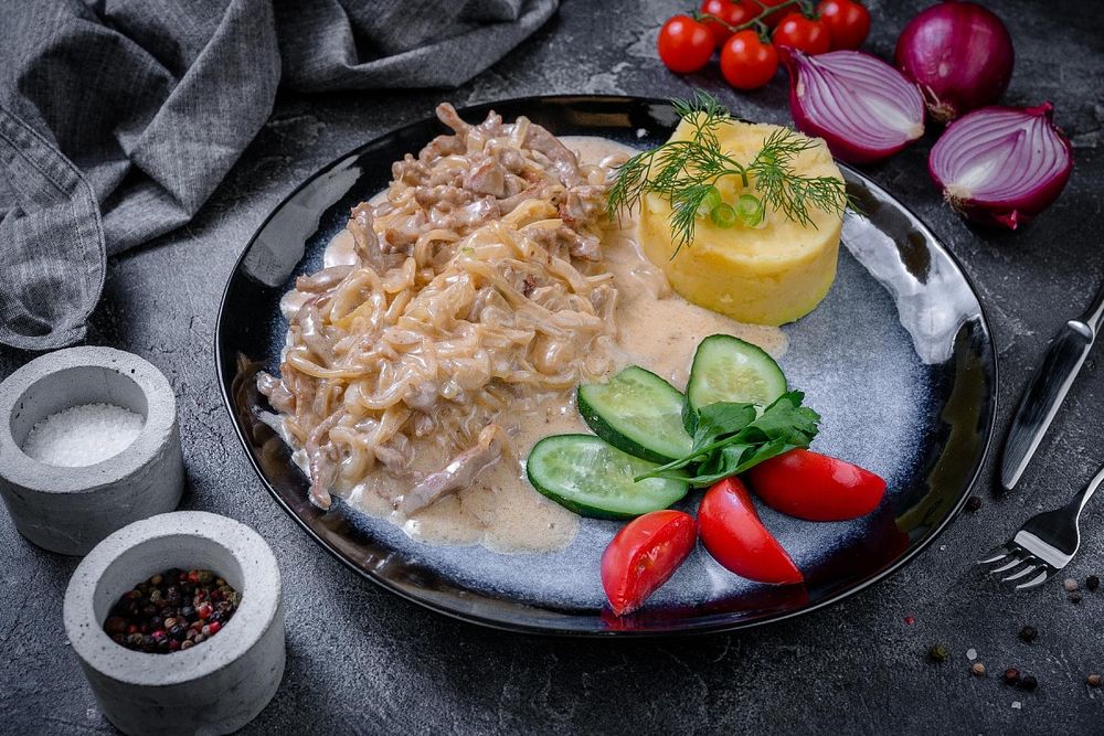 Телятина обжаренная с луком и сливками. Подаётся с гарниром на выбор