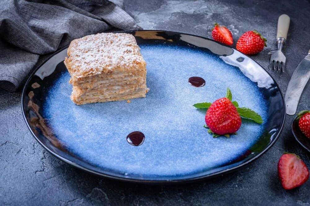 Классический торт Наполеон. Подается со свежими ягодами и сладкой пудрой