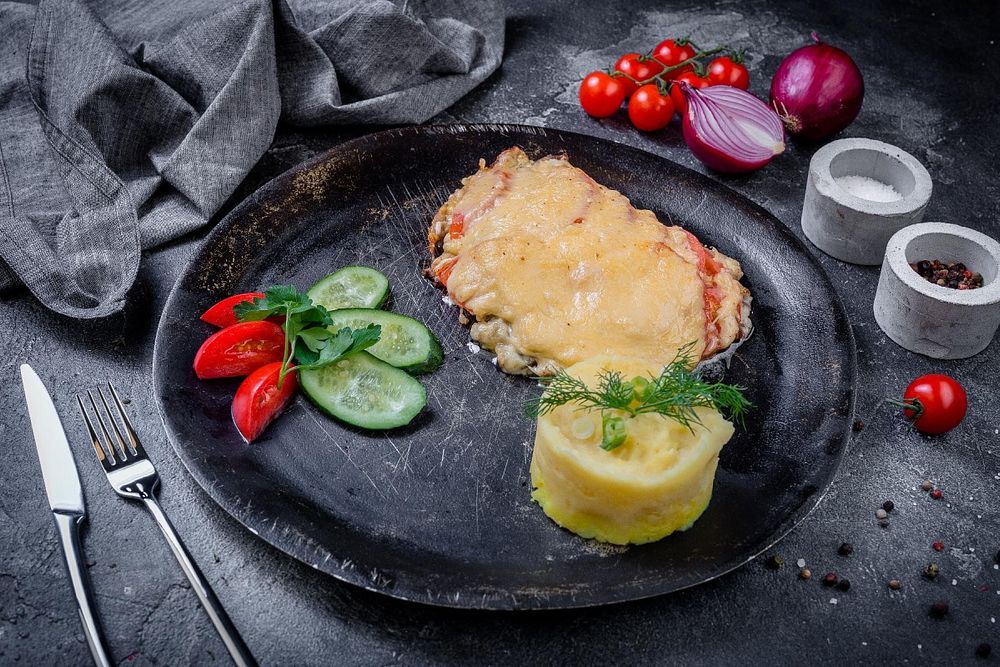 Филе индейки, помидоры, шампиньоны, сыр «Голландский» Гарнир на выбор