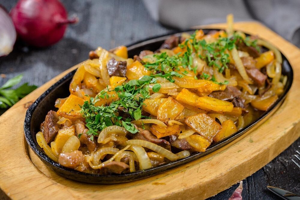 Сердце, желудки, обжаренные с репчатым луком и картофелем