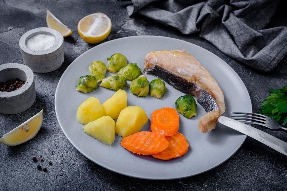 Сёмга, паровая картошка, морковка, брюссельская капуста