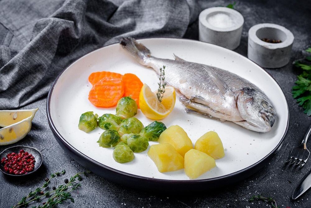 Дорадо, паровая картошка, морковка, брюссельская капуста