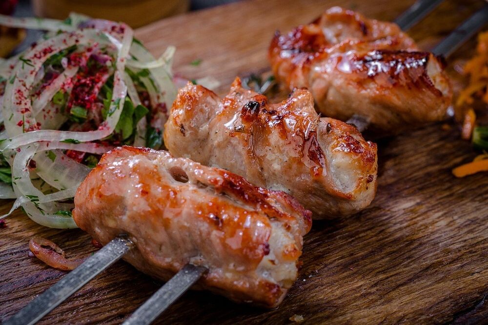 Рулетики из сочной телятины с начинкой из индейки, курдюка и лука, приготовленные на мангале