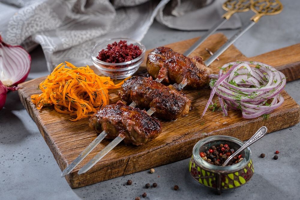 Бараний ливер в натуральной оболочке, морковь по-корейски, лук, зелень