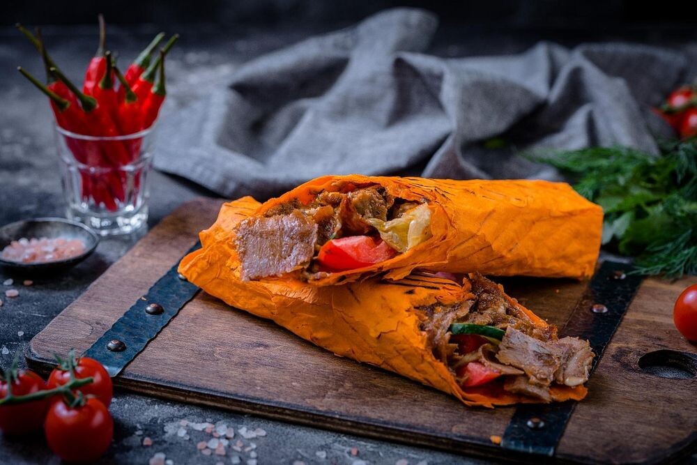 Лаваш сырный, мясо телятины, ягненка, огурец, помидор, морковь, свекла, аджика, соус от шефа