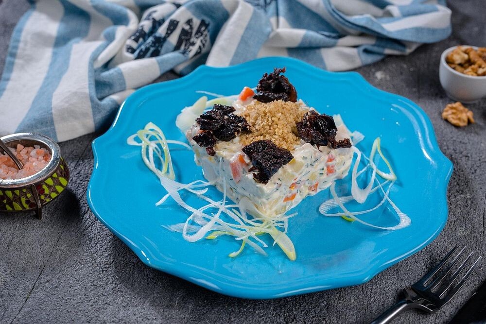 Индейка, картофель, морковь, яйцо, грецкий орех, чернослив, заправка легким майонезом