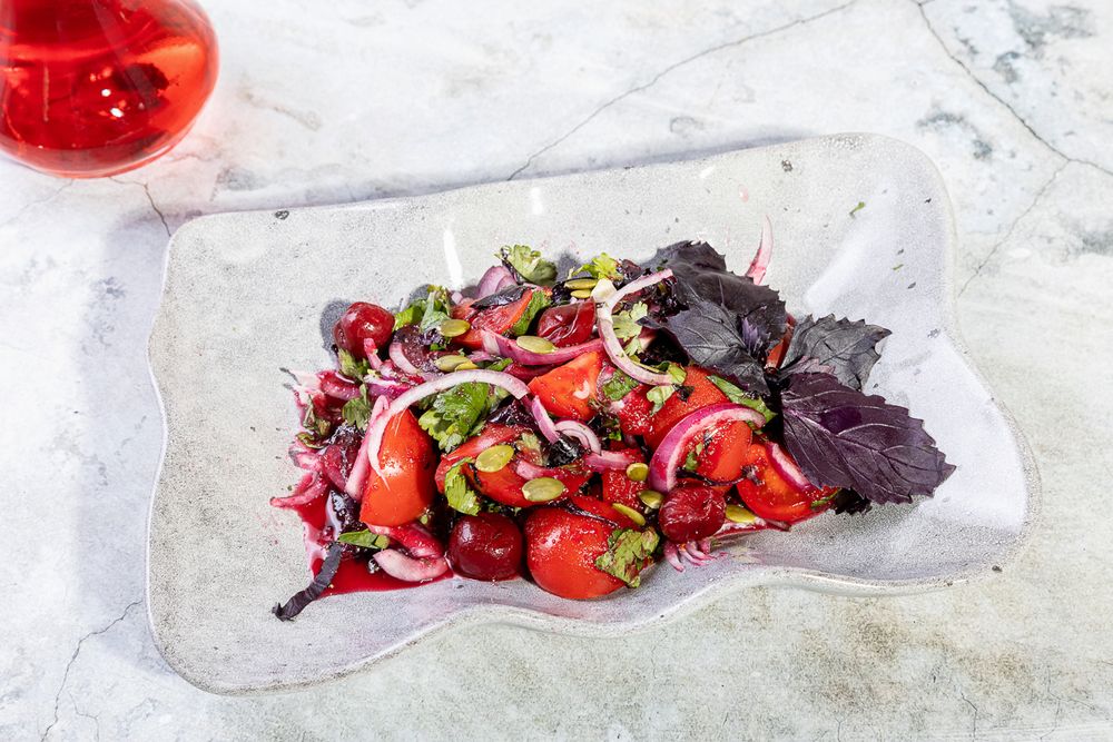 Помидоры бакинские, вишня, лук красный, кинза, рейхан, мята, кунжут, гранат, нана, соус кизиловый