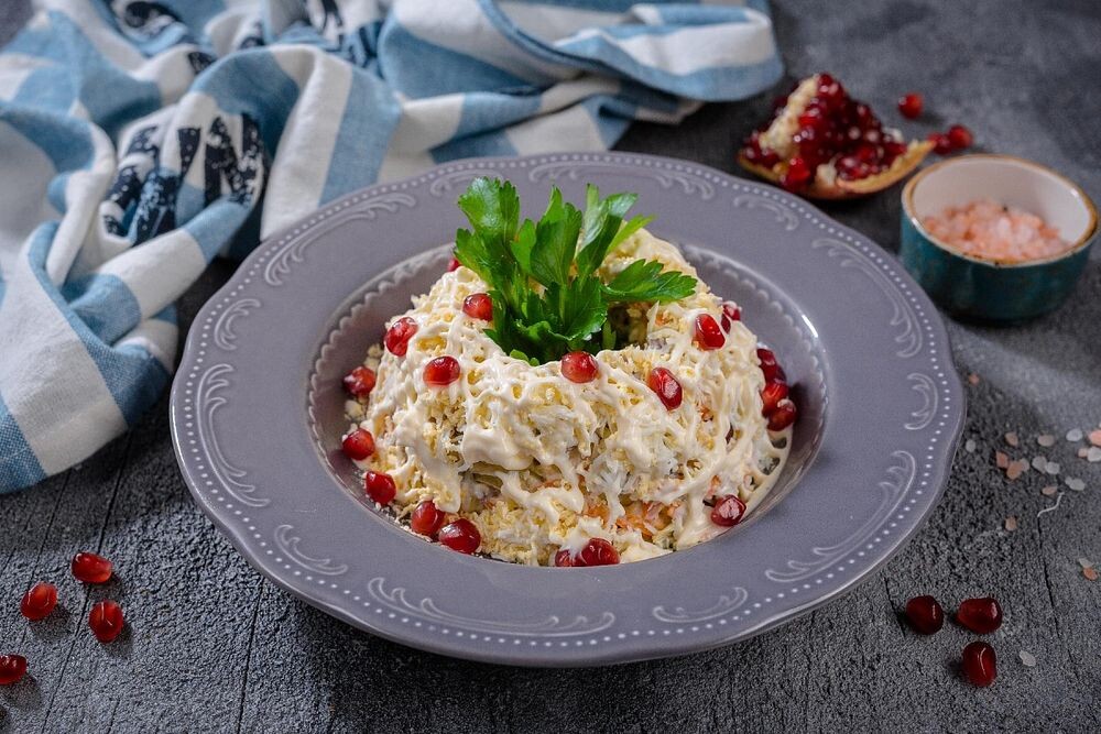 Говядина, картофель, морковь, корнишоны, яйцо, гранат, зелень, заправка легким майонезом
